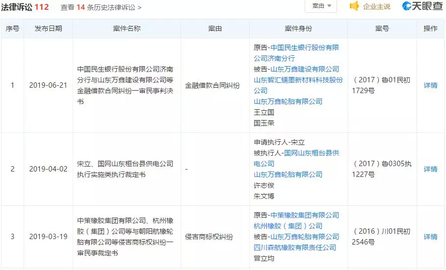 但近年来,万鑫轮胎由于债务原因,多次被银行告上法庭。天眼查显示:2018年1月11日,万鑫轮胎被张家港市人民法院列为失信被执行人。2018年7月,由山东省淄博市中级人民法院同意山东万鑫轮胎破产的申请。