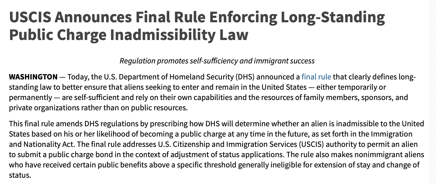 这项规定是对移民法中“基于公共负担理由不予受理”的条款作出调整,扩大了移民管理机构对“公共负担”的定义范围,将食品券、医疗和住房补助等公共福利纳入其中。领取或接受上述福利的移民,将被认为有可能在未来成为“公共负担”,从而在申请绿卡或入籍时遭到拒绝。
