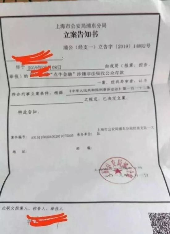 8月8日,点牛金融被立案的消息的立案截图率先从投资人群中流出,这份立案告知书显示,点牛金融投资人向上海公安局浦东分局报案,点牛金融涉嫌非法吸收公众存款一案,经浦东分局审查,符合刑事立案的条件,已决定立案。