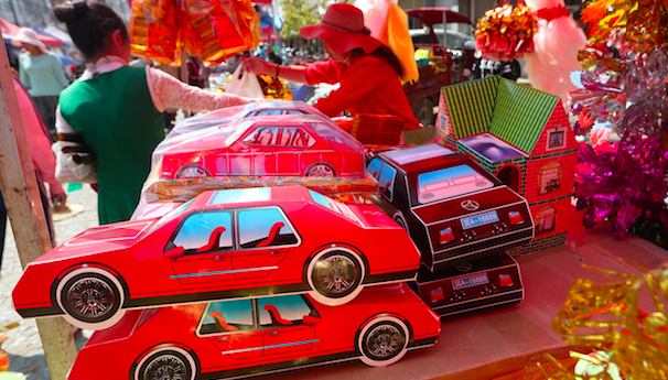 一些摊贩故作神秘地向顾客问道,“老板,想要一些更值钱的东西吗?”记者就问,还有新东西?这个五十来岁的女人说道,“有一些祭品我们不敢拿出来卖,但是我们就放在附近,如果你真的想要,我可以拿过来。”在离此不远的一个地方,记者看到一堆纸制的房子、汽车、仆人、妙龄美女,甚至还有飞机、坦克和冲锋枪。记者假装好奇地问道:“之前人们烧汽车我还理解,但是你卖的这些坦克和冲锋枪有什么用?”女人回答,“如今阴间也不安全啊。如果你烧一些武器寄给祖先,他们就不会被欺负。”(Zu 2006)
