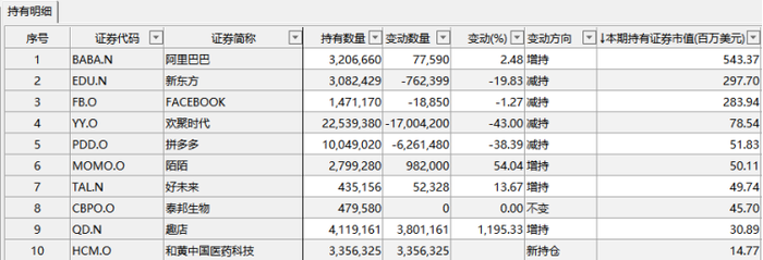 具体来看,景林的第一重仓股为阿里巴巴,持有股数为320.67万股,相较于一季末增持7.76万股,持仓市值高达5.43亿美元,占整个组合约36%的比重。而第二、三、四、五大重仓股分别为新东方、脸书、欢聚时代和拼多多,但相比于景林对阿里巴巴的加仓,这些股票均遭到不同程度的减持。
