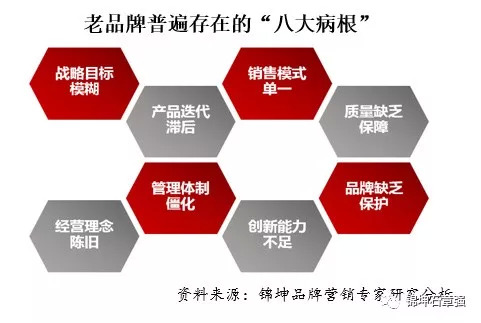 以上所述老品牌的每一个“病根”通常会引发二次传染或病变,而当这些固有的“病根”经过繁衍和促进后,会形成一系列的恶性循环,并最终演化成致命的“顽疾”。如战略缺失、迷茫和不清晰,所有的策略执行和经营管理就容易陷入“滑西瓜皮”的状态;产品缺乏创新、质量不好,市场竞争力低,销售业绩自然就会下滑。