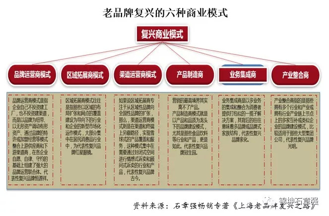 商业模式实际上就是品牌的赚钱模式。而大部分老品牌的没落和衰落,除了体制上的原因之外,最大的影响因素就是品牌的商业模式不能与时俱进而被对手超越,或被竞争形势所逼而固步自封。在换商业模式的复兴模式中,分别有品牌运营商模式、区域拓展商模式、渠道运营商模式、产品制造商模式、业务集成商模式、产业整合商模式等六种模式。