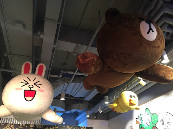 整个店面有两块区域用作餐位区,都被Line Friends的卡通人物包围住。立着的、飞天的,画在墙上的,再加上盘子里或是瓶子上的,嗯,最后千言万语都只能汇成一个字:萌!