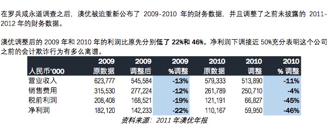 在Blue Orca Capital的报告中也提及了上次澳优造假的始末。报告称,2011年,澳优重新公布了2009至2010年的财务数据,并调整了2011年-2012年的财务数据。调整后的2009年和2010年的净利润分别比调整前下降了22%和46%。