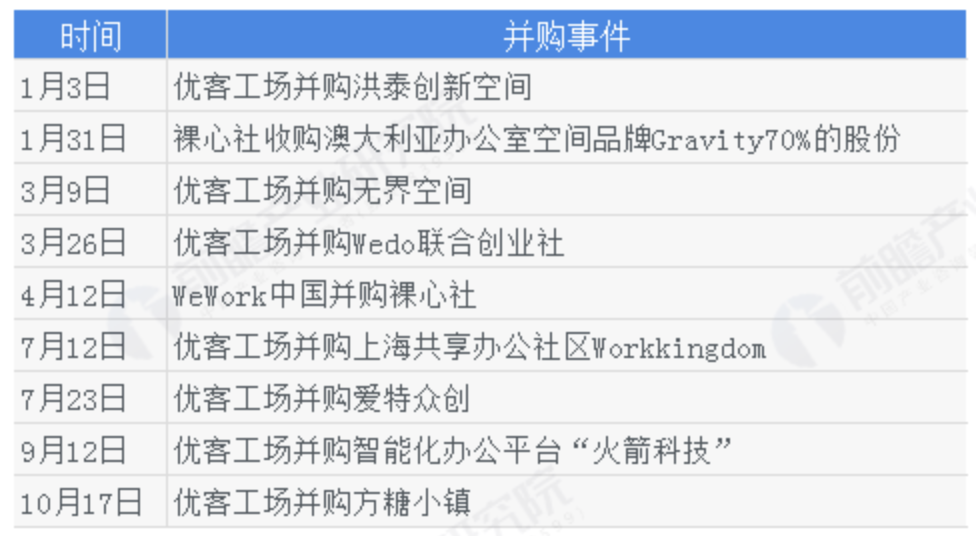 在行业遇冷的态势下,这样的中小联合办公企业被接盘或者说并购的案例并不在少数。其中行业皆知的大并购案,就包括WeWork在去年吞并裸心社,优客工场2018年也对洪泰创新空间、无界空间、Workingdom及方糖小镇(近7家平台)等进行了并购。