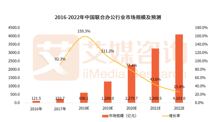 不过从第三方调研机构的相关统计中,可以略窥究竟。根据iiMedia Research(艾媒咨询)数据显示,2016—2022年,国内联合办公行业市场规模不断增长,预估2018年为600亿元人民币,增长率达159.3%。但是艾媒咨询同时给出了2018年后增长率的下滑曲线,预计未来三年的增长率将从77%持续下滑到25%左右。