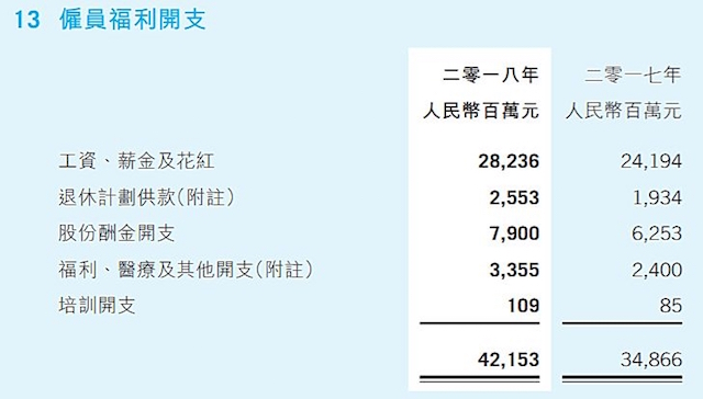 相比之前的指标,我们只统计“工资、薪金及花红”一项,这也考虑到股权激励集中在少数人,避免普通员工被平均;为排除年终奖等季度性影响,使用年度数据;由于腾讯员工数一直在扩张,还做了项修正,即以年初和年末人数的平均值,作为当年领薪人数的指标。