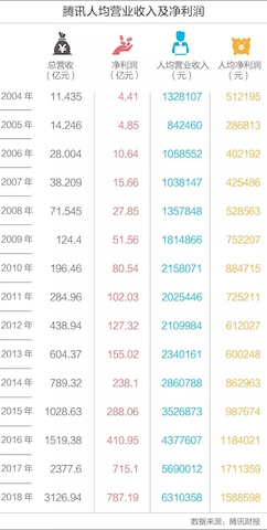 相比员工,金字塔尖的人,薪酬增长也快得多。2004年,腾讯5名最高薪酬的人,总支出是1058.3万元,人均约200万,到了2018年,总额达到13.74亿元,人均超过2.7亿元,涨幅超过130倍,这是普通员工不能比的。