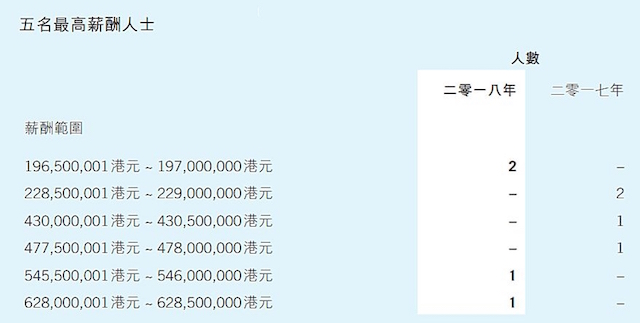 表格中,3.13亿元足够吓人了,在鹅厂也就只能排第三,根据“五位最高薪酬人士”的数据,最多的人一年拿了6.28亿港元,还有一个人拿了约5.45亿港币,他们薪酬大头应该是股份。