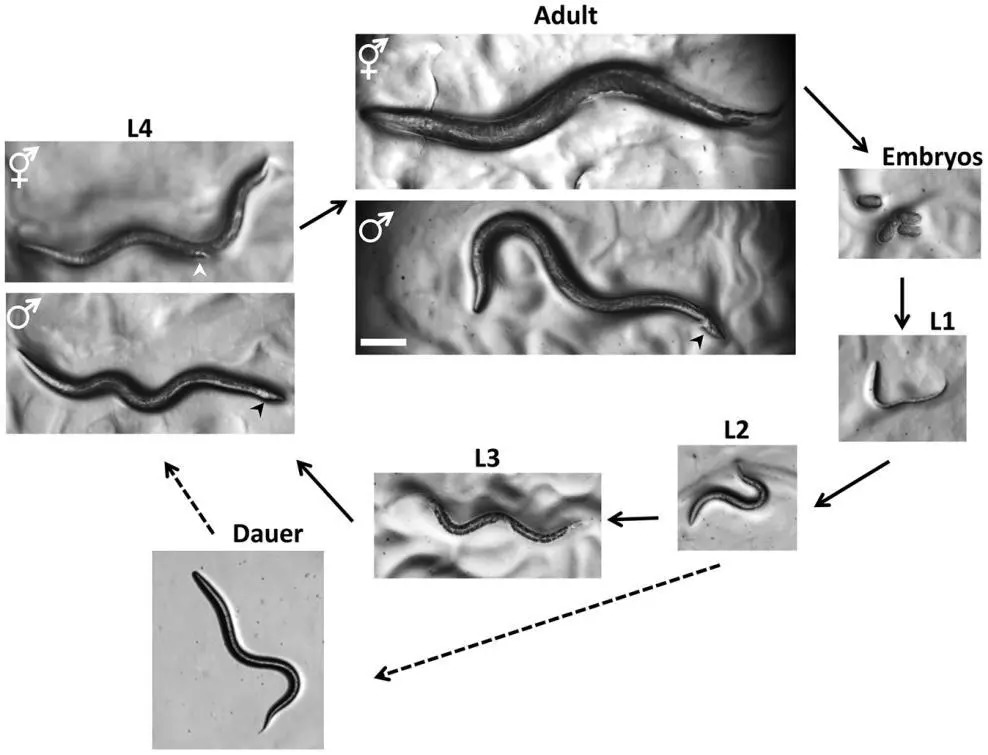 在秀丽隐杆线虫中,科学家Sherwood发现了在到达性成熟前存在发育检查节点(checkpoins),用于评估当前条件是否适合继续发育,如果出现食物短缺等情况,发育就会停止在这一节点上并形成一种叫dauer的幼虫形态,dauer能存活数月之久远长于正常三周的平均寿命并且不会衰老,直到条件适宜后继续发育。