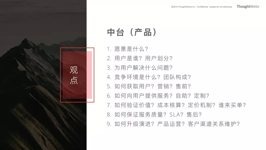 答:给中台一个边界,产品的边界,将中台团队从共享职能团队转变为中台产品团队,将前台与中台的关系由被服务与服务的关系变为产品与产品的关系 ,即: