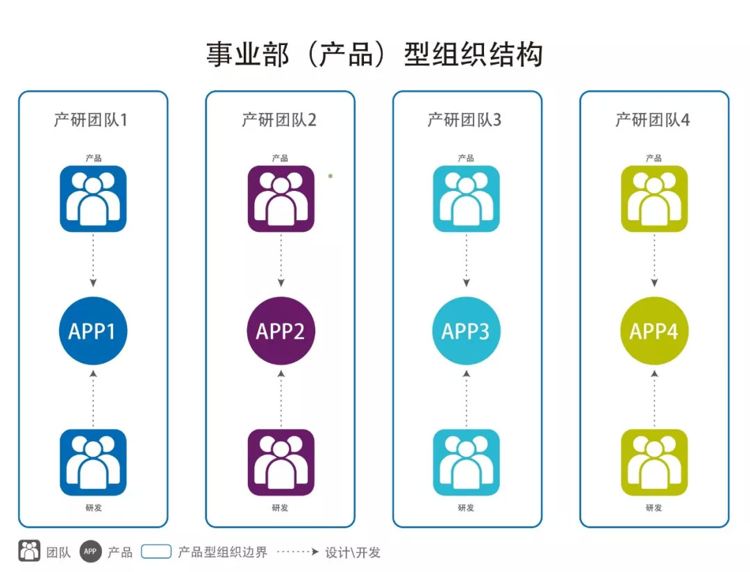 中台概念来自互联网,那我们就再来看看另一种在互联网企业更常见的组织结构,事业部(产品型)组织结构,是不是就可以在中台建设的过程中避免出现类似的问题?