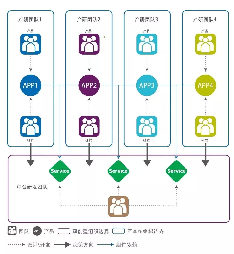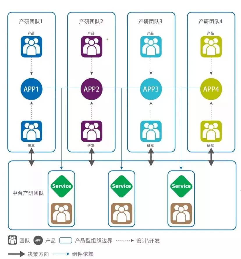 究其原因其实也是一样的,中台团队因为不是直接服务于终端最终用户,而是通过服务前台产品团队间接服务终端用户。所以并没有直接的收入来源,需要从各个产品线抽取一定的资源(人+钱),组建中台团队,为前台团队服务,前台团队与中台团队的关系与直线职能型组织一样,仍是一种被服务与服务的关系,区别无非在于前台是产品型还是职能型团队而已,并无本质区别。