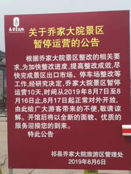 “根据乔家大院景区整改的相关要求,乔家大院景区暂停运营10天,开馆后将以全新的面貌、优质的服务迎接您的到来。”