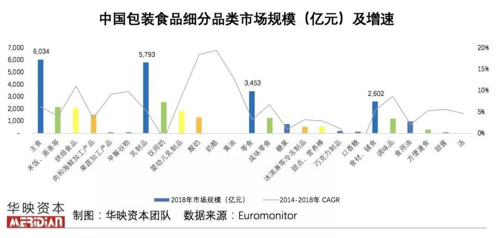让我们把目光拉回中国市场。2018年中国包装食品市场总规模达17,890亿元,是世界上仅次于美国(27,239亿元)的第二大市场。自2015年起,市场规模加速扩张,2018同比增长6.8%,跑赢同期人均GDP增速。