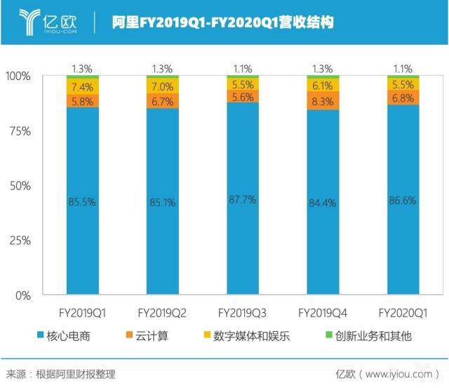 在阿里的财报中,电商业务一直以来算是最大的营收功臣,不仅营收占总营收的比重高,而且更重要的是电商业务的增速都很稳定。在这个季度,核心电商仍然是阿里唯一一项盈利的业务,营收同比增长43.9%,占总营收比重达到86.6%。在2018财年第四财,阿里的电商营收曾达到62%的同比增速,虽说几个季度虽说有点下滑,但基本上都保持在50%的同比增速范围内,这也还是说明阿里旗下的电商业务实力强劲。