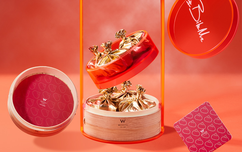 上海外滩W酒店每年的月饼都令人期待。“邀 摇 咬 耀”可能是最会“玩”的月饼礼盒。礼盒灵感来自于上海小笼包,竹质蒸笼和霓虹色亚克力材质拼接在一起,月饼则“穿”上了金色外衣,仿佛一只只金色小笼包。“笼”内还配有一双有W标志的金色筷子。