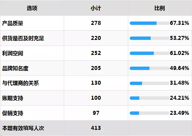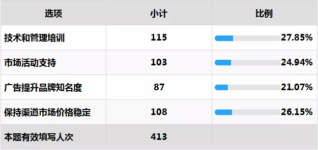 从厂商得到的支持,有技术管理培训,市场活动支持,广告提升品牌知名度,保持渠道市场价格稳定四项,均在25%左右。由此可见,店主在这四项上,均有较大的需求。