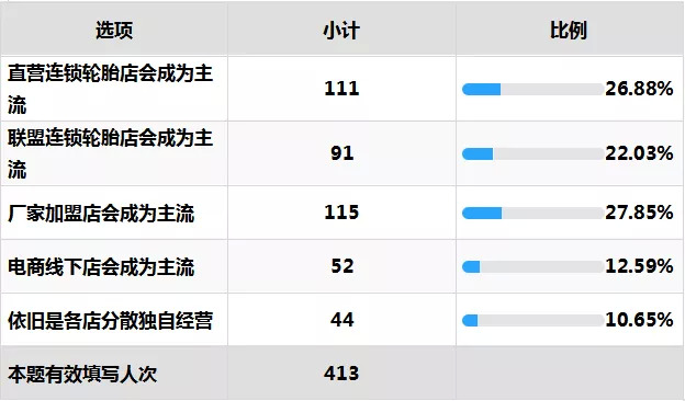 在关于未来中国轮胎零售店的主流方向调查中,27.85%的轮胎店认为厂家加盟店会成为主流。26.88%的轮胎店认为直营连锁轮胎店会成为主流。两者占比最高。这也意味着,连锁和厂家加盟是最被门店认可的未来轮胎店模式。