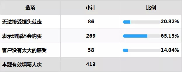 轮胎涨价后,客户的接受程度如何呢?在我们的调查中,我们发现65.13%的轮胎店表示客户能够表示理解并还会继续购买。其实,轮胎,特别是大车轮胎作为一种低频必需的商品,涨价和跌价都不会对司机更换问题轮胎影响太大。当然,也存在20.82%的车主表示无法接受,掉头就走,这也反映了司机和店主之间的沟通和理解还有加强。
