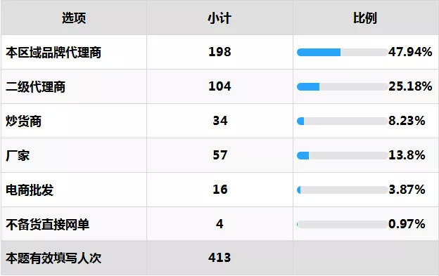 数据显示:47.94%的门店是从本区域品牌代理商进货,其次是二级代理商,占了25.18%。而电商和网单最少,总计不到5%。由此可见,现在的卡客车轮胎店还是非常注重渠道的,一个好的、正规的渠道,货品质量才有保证,而网络渠道目前还无法的到店主的信任。