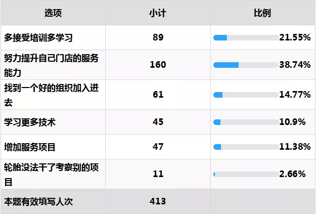 在“2019年做为轮胎店主最应该做的事情是什么”的调查中,38.74%的人选择了“努力提升自己门店的服务能力”,占比最大,这也说明了有越来越多的轮胎店认识到了轮胎店提升服务水平的重要性。服务为王的理念,将来也会越来越深入人心。