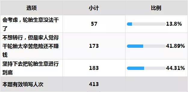 在关于是否要转行的话题中,41.89%的轮胎店选择不转行,但家人却不理解。选择坚持下去的门店占了44.31%,他们决定把轮胎生意进行到底。其实此前已有不少店主反映想要转行,要么苦于利润低,要么觉得危险,要么迫于家庭压力,最后心灰意冷,萌生转行的念头。