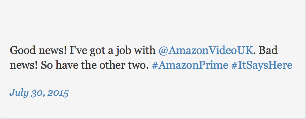 (好消息!@亚马逊视频英国 给了我一份工作!坏消息!其他两位也是!#亚马逊金牌服务# )