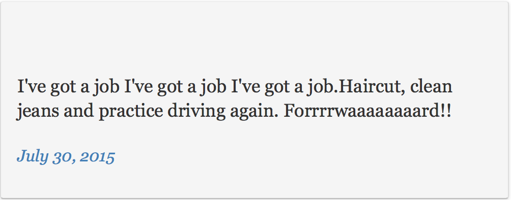 (我有工作啦!我有工作啦!我有工作啦!新发型、干净的牛仔裤、继续练习驾驶!前~~~~~进!)
