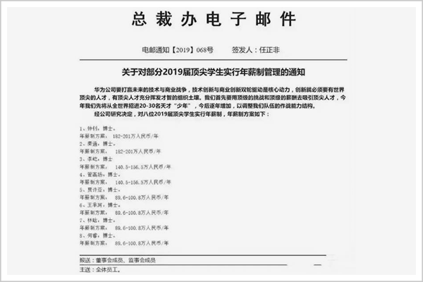 邮件显示,华为决定对8位2019届顶尖博士学生实行年薪制,年薪范围在89.6万元至201万元不等。其中,两人的年薪制方案为182万—201万元/年;两人的年薪制方案为140.5万—156.5万元/年;另外四人的年薪制方案也高达89.6万—100.8万元/年。