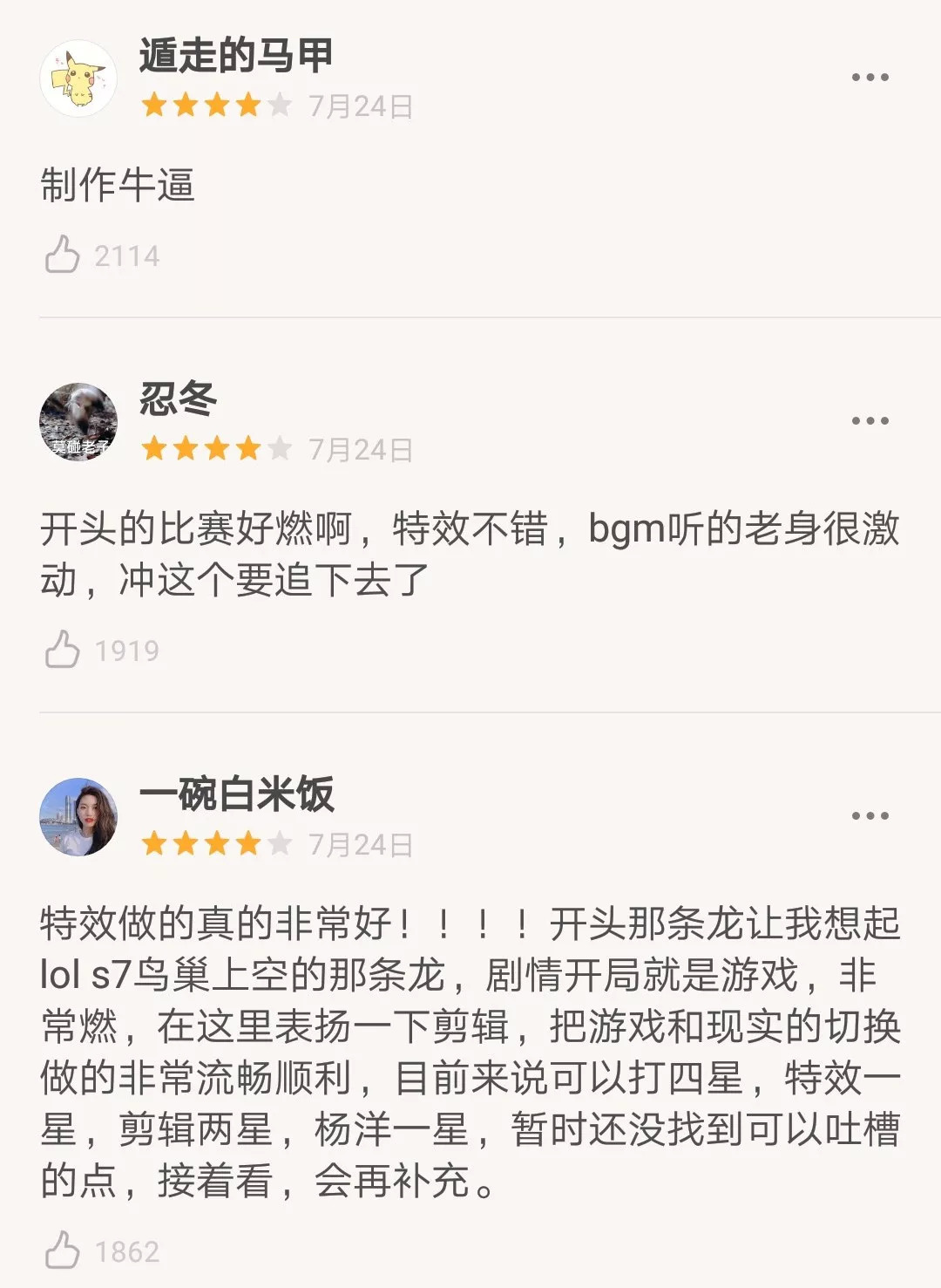 《全职高手》电视剧播出之后,CG特效的大量运用及电竞场景的高度还原,使其迅速成了“真香”现场,豆瓣评分达到7分。