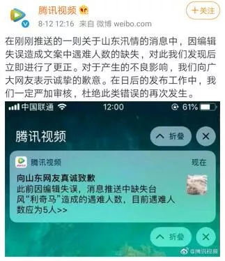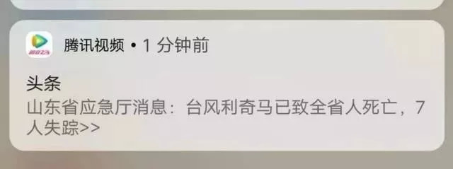 比如说这次,腾讯视频在推送一条关于台风“利奇马”的消息时,因该消息中缺少遇难人数,使得整句话变成了“山东省应急厅消息:台风利奇马已致全省人死亡,7人失踪。”语意出现重大扭曲。