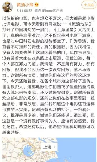最近饱受争议的电影《上海堡垒》就是如此,因为剧情、演员、特效集体下线,豆瓣评分3.2。就在整体舆论骂得热火朝天时,电影导演滕华涛在微博上公开道歉。