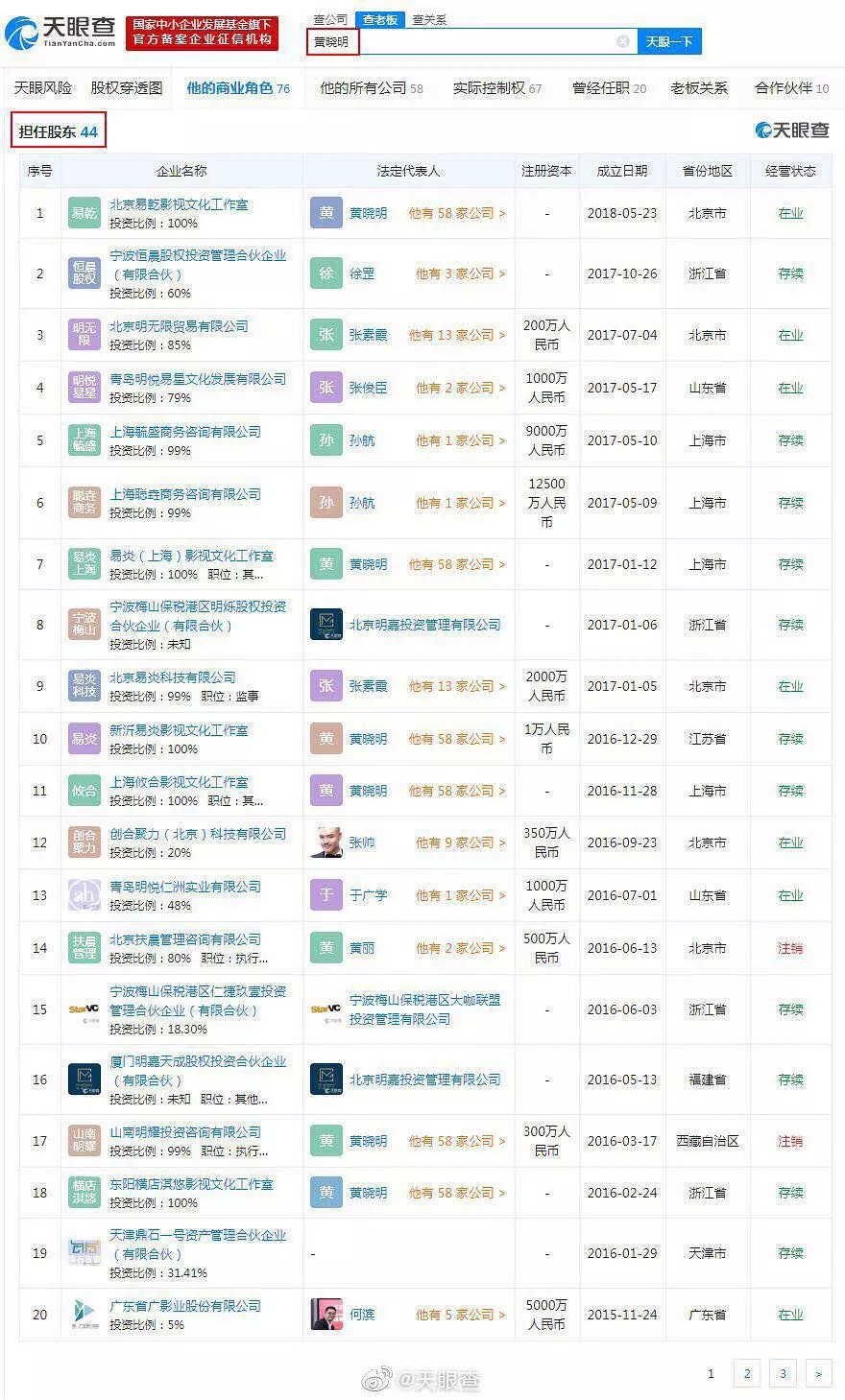 天眼查显示,黄晓明名下有58家公司,实际控制权有67家。试问一个小小的中餐厅都经营成这样,这么多公司是怎么运营的?