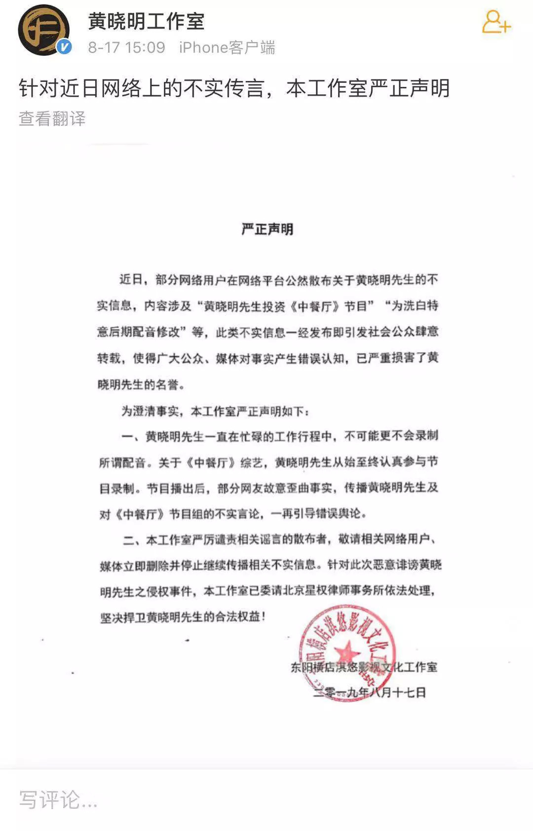 8月17日中午,黄晓明工作室针对“黄晓明投资中餐厅”、“为洗白自己后期配音修改”等网络传言发出声明,否认传言真实性,表示网络流传的不实信息使公众产生错误认知,已严重损害艺人名誉。