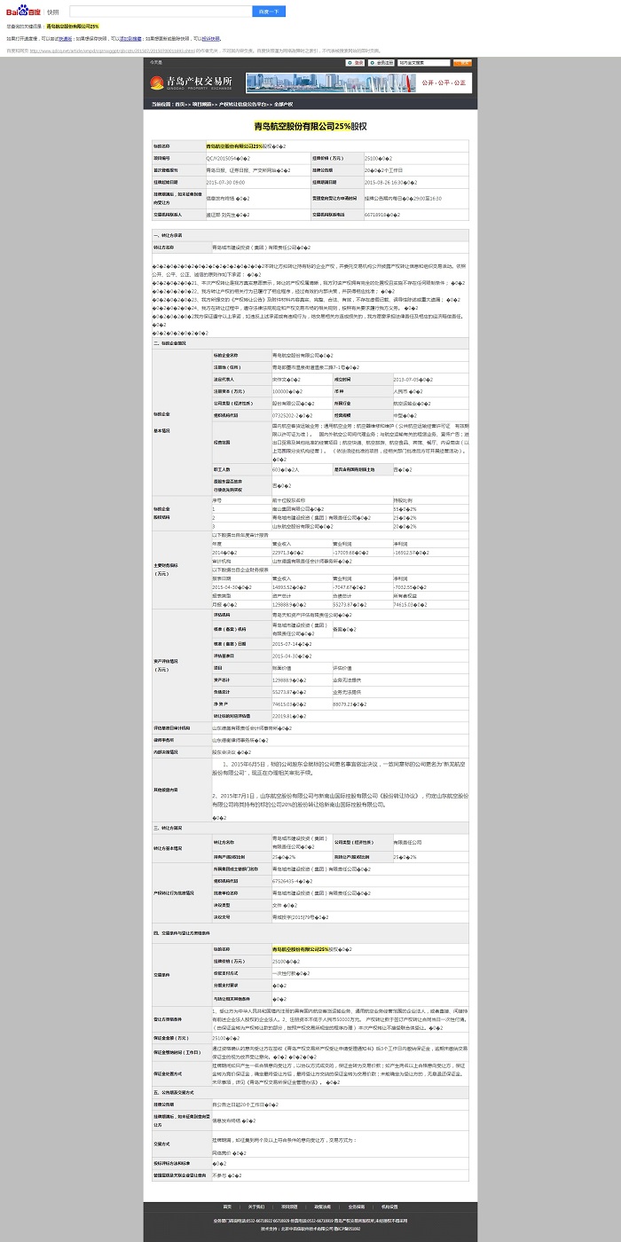 7月30日,青岛产权交易所产权转让信息公告平台挂出青岛航空股份有限公司25%股权的标的。根据标的公告,青岛城市建设投资(集团)有限责任公司(下称青岛城投)有意将其持有的25%的股权作价2.51亿元一次性出清,这是青岛城投持有的青岛航空的所有股权。