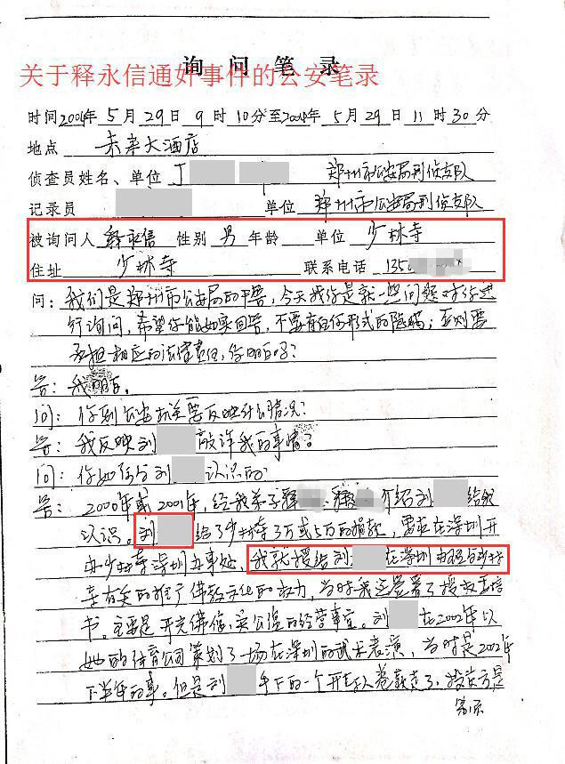 材料显示,释永信是2004年5月29日9点10分到11点30分这两个多小时的时间内,在郑州未来大酒店向郑州市公安局刑侦支队反映情况的。