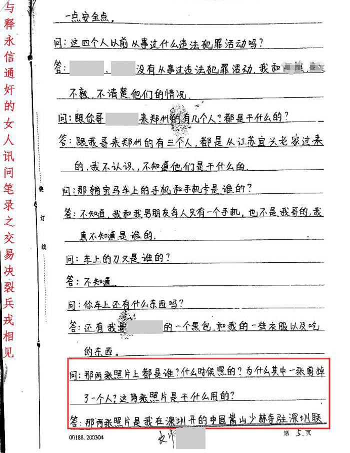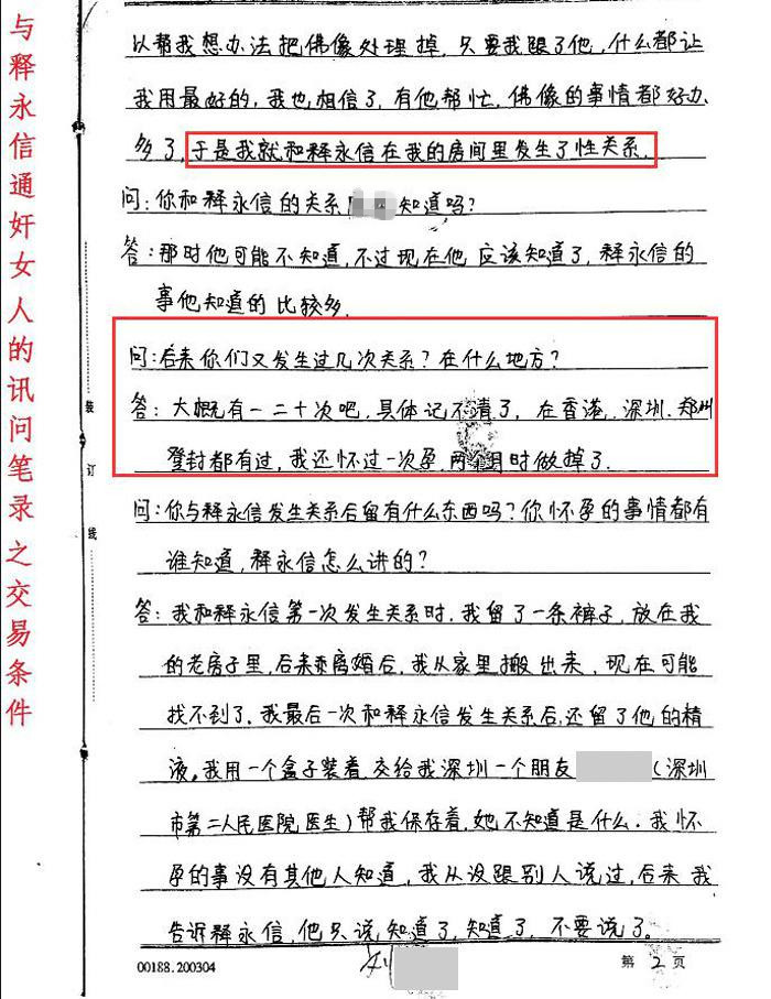 除了笔录内容,“释正义”显然知晓更多情况,他在第一封举报信中曾透露,“刘某某2002年6月初在深圳第二人民医院曾为释永信做人流一次。”后期,“刘某某让郑州公安局民警前往深圳,在朋友帮助下,取到了释永信和刘某某发生性生活时留下的避孕套等。”