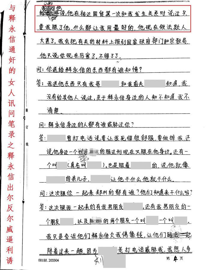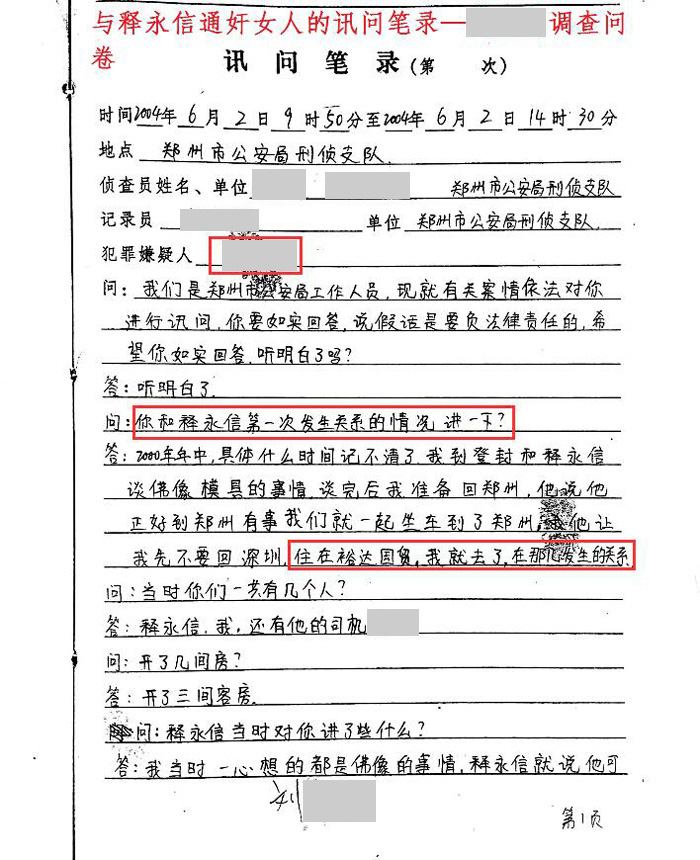 根据“释正义”提供的女方笔录,刘某某称她和释永信是情人关系,并且非常详细地说出了第一次和释永信发生关系的时间、地点,称释永信以许诺帮忙处理佛像事宜,告诉她“只要跟了他,什么都让她用最好的。”