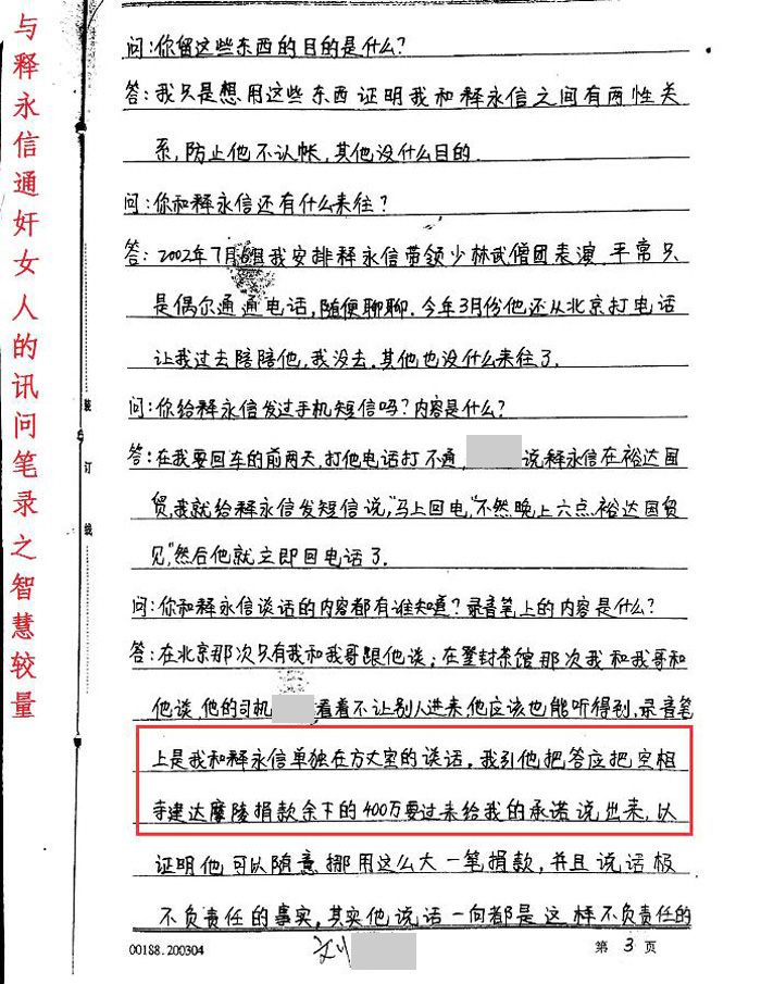 笔录材料显示,在后期谈判过程中,刘某某曾要求释永信答应把空相寺建达摩陵的捐款剩下的400万给她,并说出来。而刘某某用录音笔录下了释永信的话。