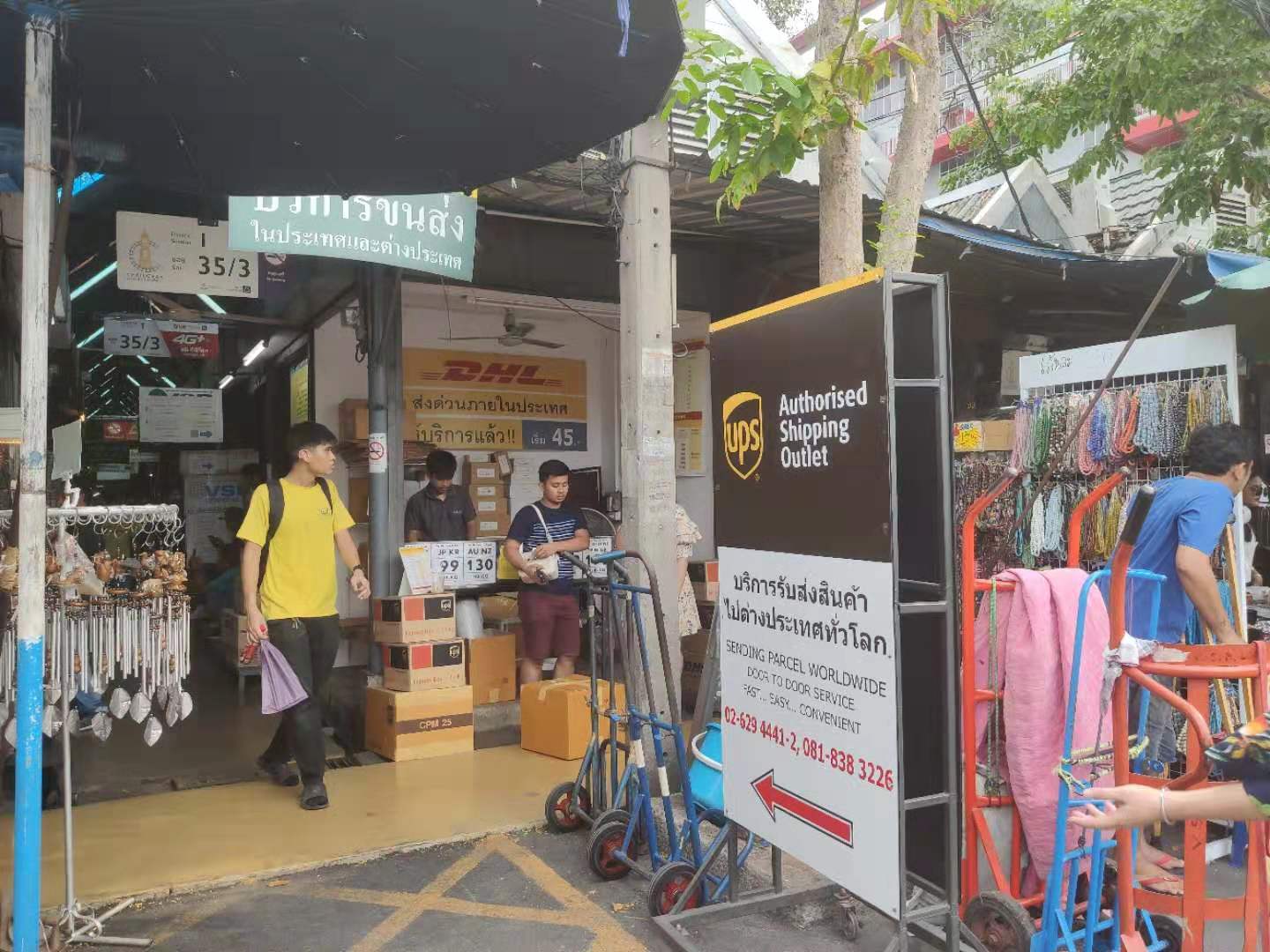 集市一家泰国乳胶枕头品牌店中,挂着中英文促销广告——买三个枕头包邮,DHL、顺丰、中通、申通都可选。而泰国嘉里物流(Kerry logistics)、印尼j&t快递、DHL、UPS在附近都设有收发包裹的站点,火药味颇浓。