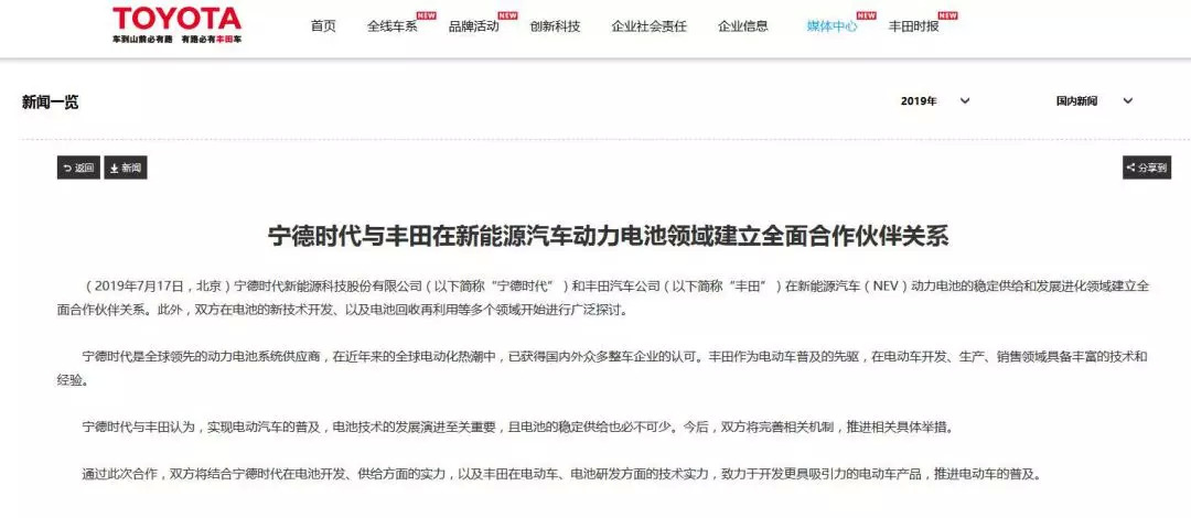 虽然新建厂房的消息尚未正式宣布,但是丰田在华的新能源步伐显然走得非常快,仅在7月份,丰田在一天内宣布与宁德时代、比亚迪达成合作关系,与前者建立稳定的新能源汽车动力电池的稳定供给关系,跟后者共同开发轿车和低底盘SUV的纯电动车型、以及适合使用的动力电池。