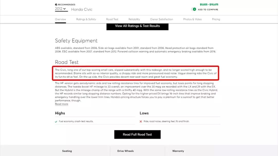 一直以来,美国《消费者报告》都非常重视本田思域这款车,而且有很多年这款车都是他们的年度推荐车型。但是第九代思域上市之后,他们却给出了“这一款思域的变化不足以让我们再一次给出推荐的成绩”的回答。