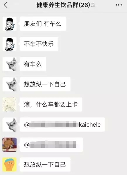 而群里的所有人都熟练掌握一系列神秘暗号,保持着能让天下大同的超然默契:“上车吗?”“ 什么车?乐还是扣?”“ 车门锁死,不加单啦。。。”