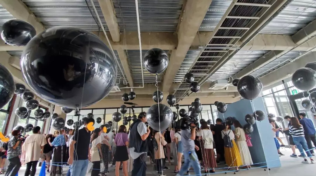显然,从会场的布置上你可以看出来,主办方也没有想好,会场入口被布置上了大大小小黑色的气球,对,它们就是木薯珍珠了。