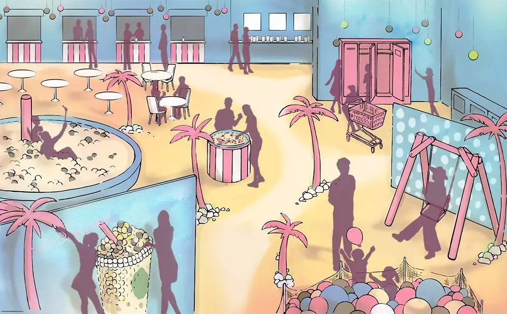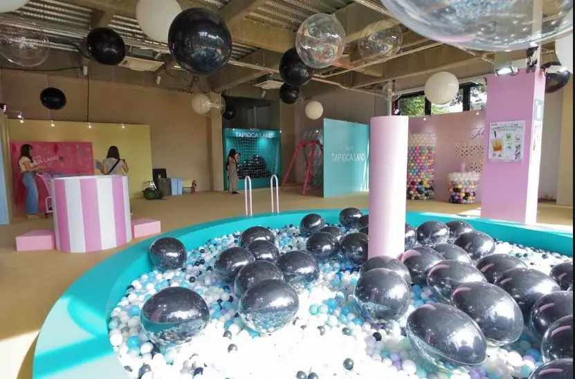 场馆设置紧扣奶茶主题,像是飘满珍珠的 “ 泳池 ”。。