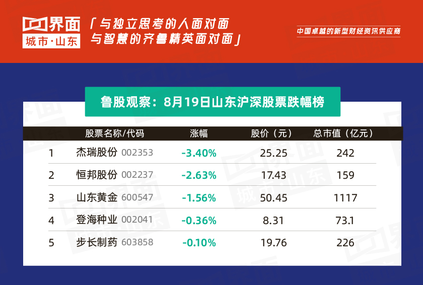 烟台市跌幅榜首:杰瑞股份(002353),涨幅-3.40%,股价25.25元,总市值242亿元。