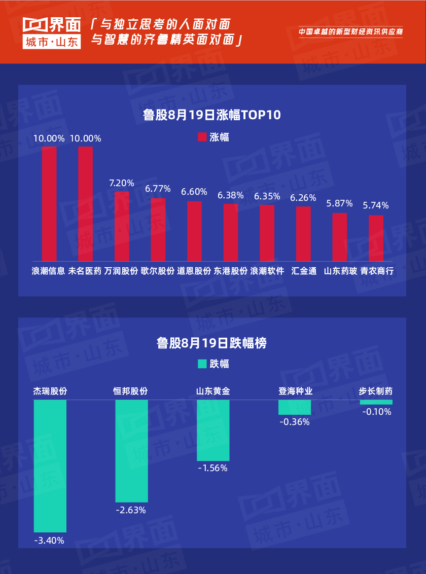 8月19日,山东省内沪深股票有199只个股上涨,5只下跌,0只与上一个交易日收盘价持平;浪潮信息(000977)、未名医药(002581)两个股均涨停,领跑山东板块。
