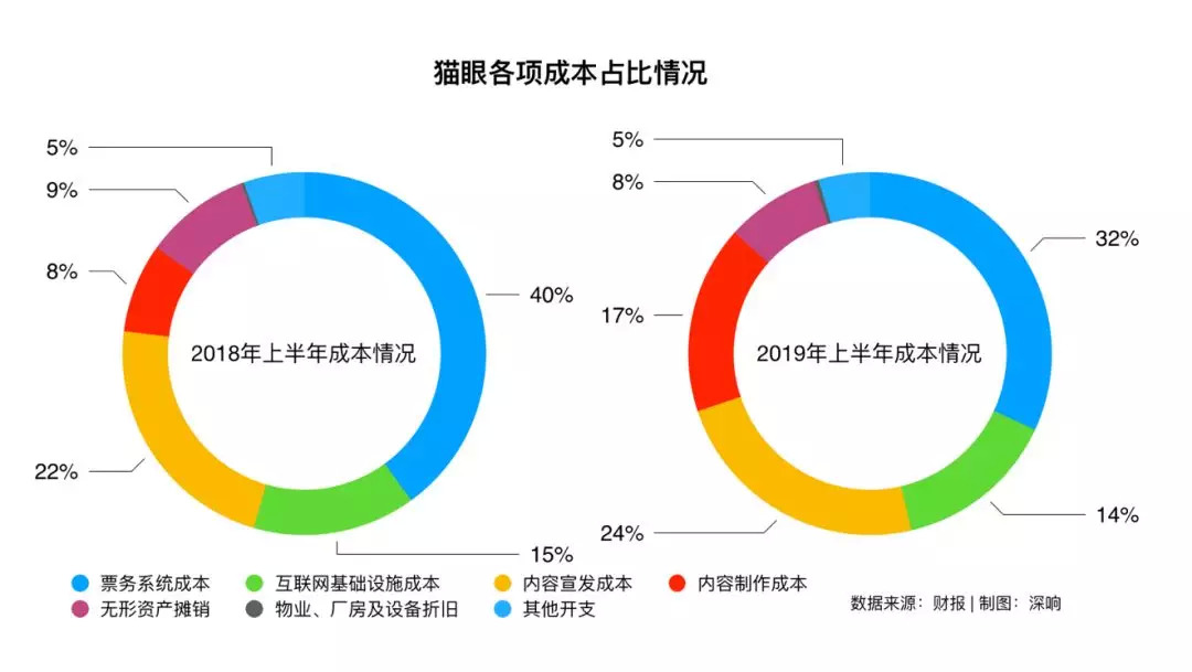 在成本方面,猫眼也有一些变化:票务系统成本为2.545亿元,同比下降10.29%;互联网基础设施成本为1.153亿元,同比增长11.94%;内容宣发成本为1.875亿元,同比增长17.55%;内容制作成本为1.337亿元,同比大增136.63%。